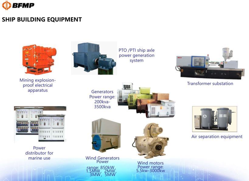 We can supply customers with kinds of Generators, Motors, Wind turbine generators, Air separation equipment, HV/LV power distribution units, Electrical propulsion system, Mine-used electric appliance, Heat exchangers etc.