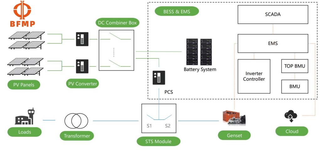 能量管理系統(tǒng)(EMS):智能調度各能源來源,優(yōu)先使用光伏,必要時啟動柴油發(fā)電機,確保供電連續(xù)性。