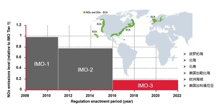針對國際:根據(jù)國際海事組織(IMO)海上環(huán)境保護(hù)委員會第66屆會議(MEPC66)以及MEPC.251(66)決議通過MARPOL附則VI和2008NOx技術(shù)規(guī)則修正案,并于2015年9月1日起生效實施。進(jìn)入排放控制區(qū)的船舶滿足《國際防止船舶造成污染公約》第三階段氮氧化物排放限值要求。